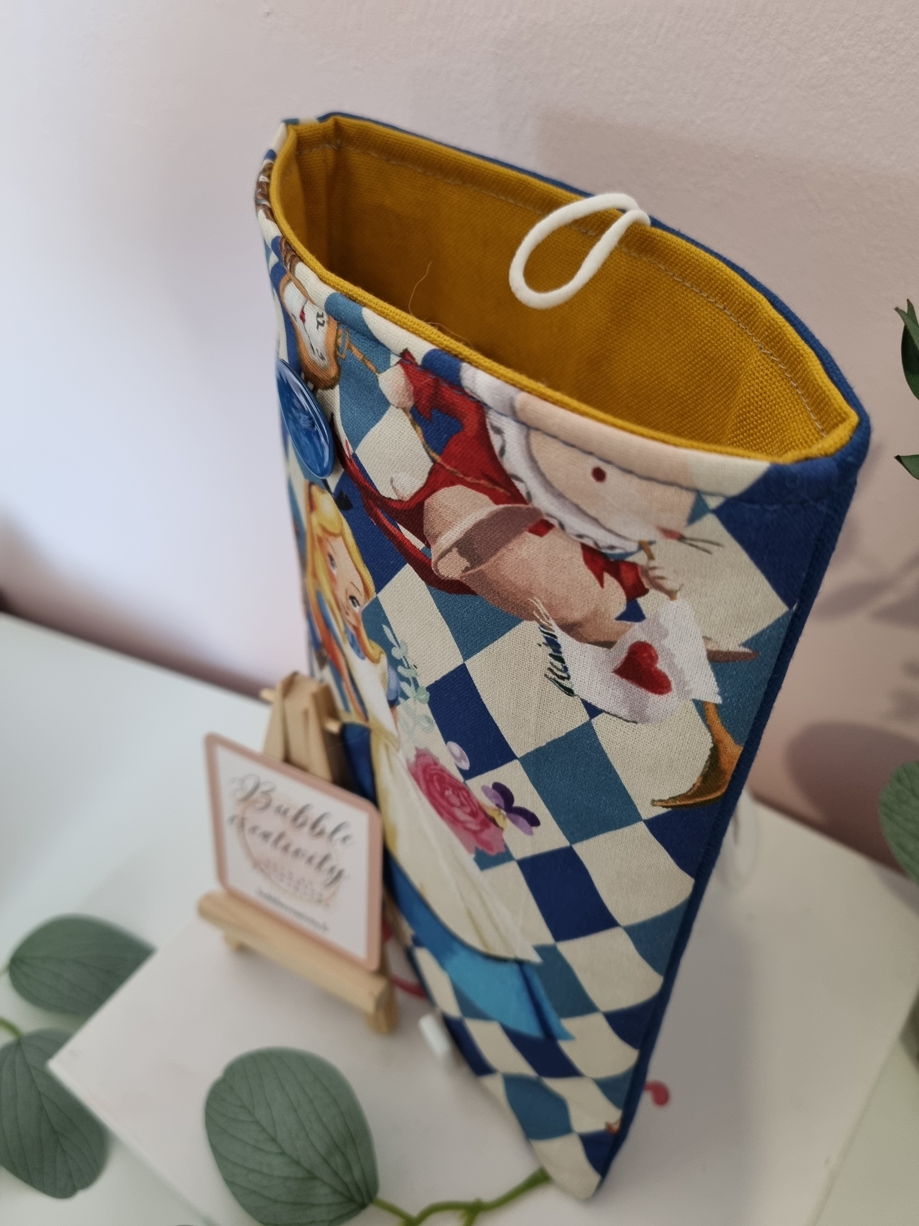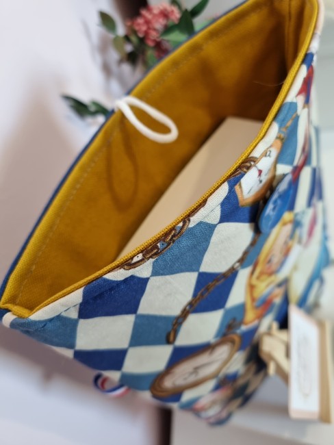 Réalisé avec des matières cotons, aux multiples couleurs bleu, moutarde et renforcé pour garder votre ouvrage en sécurité.