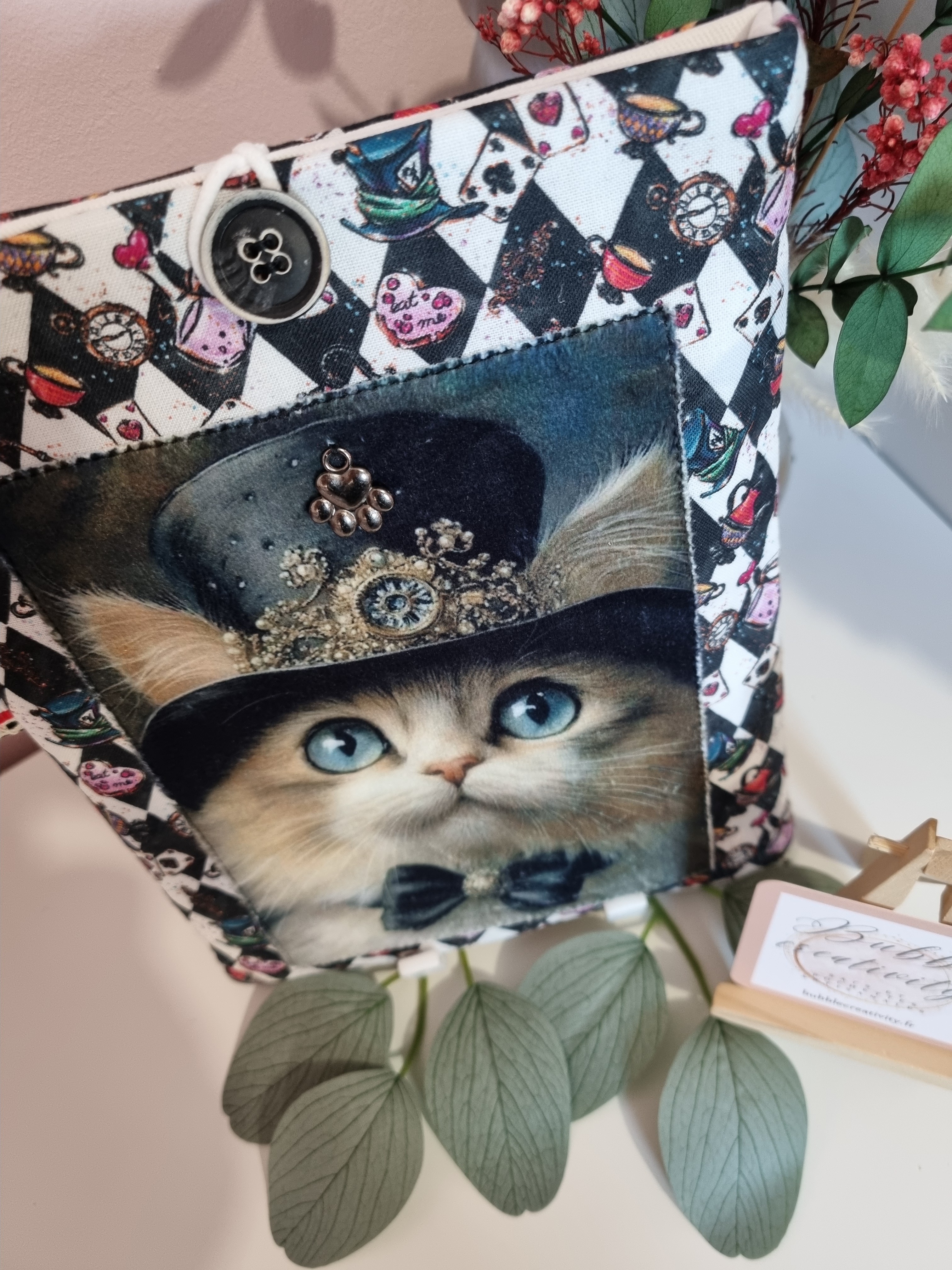 Avec son design raffiné mettant en scène un adorable chat aux yeux bleus, délicatement habillé d’un chapeau orné et d’un nœud élégant, cette pochette séduira les amoureux de lecture et d’objets uniques. Les détails du tissu, inspirés d’un univers fantaisiste et vintage, ajoutent une véritable personnalité à cette création.